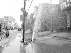 本报讯 昨日,有市民拨打本报热线电话828999称,新建路与六一路交叉口附近,有两处水管爆裂,强烈的水流喷出2米多高的水花,迫使路边商户关门“避雨”。