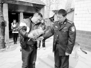 昨日,一只受伤的国家二级保护动物苍鹰流落到商水县邓城镇前史村后(如图),村民吴趁新等人在对其保护的同时,及时报警求助。该县森林公安闻讯,立刻驱车赶到现场救护,后把苍鹰送到周口市野生动物保护中心进行救治。