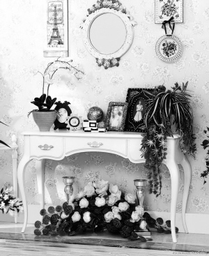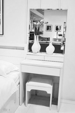 在工艺制作部分,梳妆台对漆面要求颇高,要能避免化妆品等化学物质渗入台面,造成显眼污渍,相较而言钢琴漆的镜面效果比较出彩,能让桌面各色别致的瓶瓶罐罐成为倒影中的美景。梳妆台的镜子最好是折面设计,这样就可以看到自己妆容的各个角度,是完美妆面的得力助手,连桌面上瓷器的香薰、铜质的饰物架和银质的首饰盒都成了剔透精致的背景,亦真亦幻。