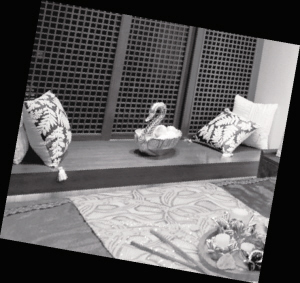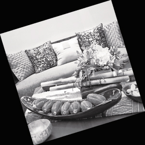 沙发:带有木质扶手(也可以充当角几),很常见的东南亚家具,既可以当角几,也可以放置摆件,而茶几的“圆拱形”融入了东南亚的建筑特色,上面陈设果盘,东南亚盛产水果,要体现水果飘香的感觉,果盘下面衬托的布艺,无论纹样还是颜色,都充满了东南亚风情。还有烛光造型的吊灯以及很多角落摆放的大小高矮不同的植物,整个空间体现崇尚自然的风格。