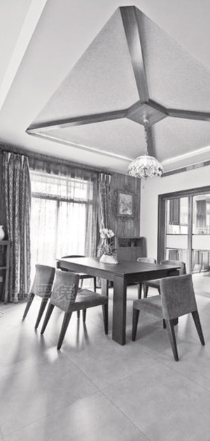 电视背景墙:与天花都做了透光的效果,营造阳光洒出来的感觉,这是东南亚建筑很典型的风格,原本用在室外,经过改良用于室内,电视背景墙的菱格纹也是东南亚很典型的建筑元素,有的则是用方格纹,电视柜的材质是原始的“雨林啡石”,也很有东南亚特点。