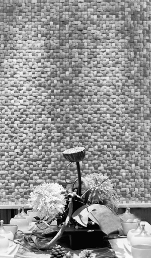 餐厅的背景墙是用椰子壳拼贴而成,椰子壳是东南亚家庭最常用到的装饰材料之一,体现了就此取材的建筑特点,再配合餐桌上的莲藕造型,以及富有泰国金顶建筑特色的餐具,拥有东南亚风格的餐厅就营造出来了。