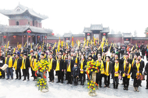 联盟新城、聿田国贸、文昌新卷、泛华新城、维也纳公园、昌隆御景园等30余家地产企业的老总、营销总监和销售代表在太昊陵通天殿前列队,虔诚向人祖膜拜,敬献花篮,祈愿功德无量的人祖天佑周口楼市健康发展。