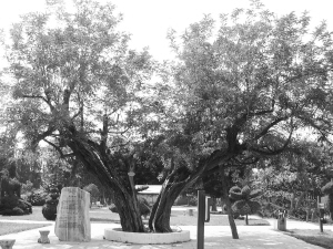 两棵千年大树背靠背向外挣脱,欲分离,好像一对闹离婚的夫妻。