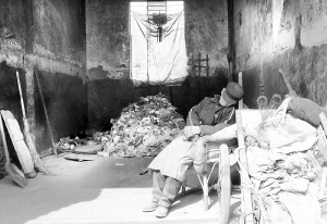 垃圾收集站,忙碌了一上午的老人,在阳光下打盹儿。