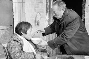“我放不下老伴,再苦再累,我也不会放弃她,我要陪她走过余生。”谈到对妻子的爱,刘永廷显得十分平静。“老伴老伴,她老了我不伴她怎么办?她需要我,她真的需要我。她在身边,我就感觉快乐。”每天刘永廷总是尽量陪在老伴身边,陪她聊天,讲故事,说笑话。