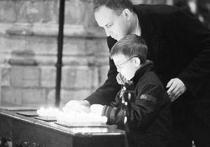 3月14日,在比利时鲁汶圣彼得教堂,一名男孩和他的父亲摆放蜡烛悼念在13日车祸中遇难的儿童。