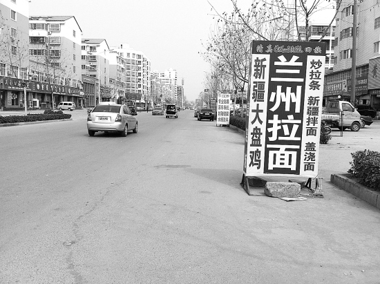近日,记者在市区光荣路看到,一家饭店把广告牌放在快车道上,给过往的行人和车辆带来不便。(实习生 段鹏/摄)