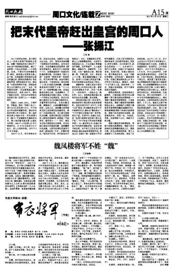 周家口漕运青花瓷博物馆、周家口民国风流博物馆、周家口抗日战争纪念馆等最终建成之后,善莫大焉。因为从清朝到民国,周口人直接参与了历史的进程,推动了历史的发展。1912年1月1日,孙中山在南京正式宣布中华民国成立,并宣誓就任临时大总统,并通告各省废除阴历,改用阳历,以中华民国纪年,1912年为中华民国元年。1月22日,孙中山发表声明,只要袁世凯赞成清帝退位,自即行辞职,让位于袁世凯。袁世凯得到这个保证后,便加紧了逼宫的进程。他以利害游说和买通庆亲王奕劻和那桐,并以金钱贿赂隆裕太后身边受宠的太监张兰德(人称小德张),威吓隆裕太后称大势已去,如果革命军杀到北京,则皇室难保,而若同意让位,则可有优待条件。1月29日召开的清廷御前会议上,溥仪决定退位,以取得革命党人的优待条件。2月3日,隆裕太后授予袁世凯全权,与南京临时政府商定清朝皇帝退位条件。至此,周口人袁世凯完成了把末代皇帝拉下马的历史使命,并因此成为中华民国第一任大总统。12年以后,另一位周口人张振江,把末代皇帝溥仪赶出了皇宫,张振江和袁世凯一样,直接参与了中国近现代历史的进程,对中国近现代历史的发展起了重要的推动作用,从而成为中国近现代历史上大名鼎鼎的人物。