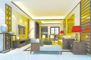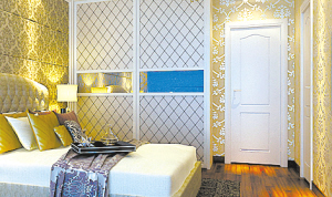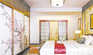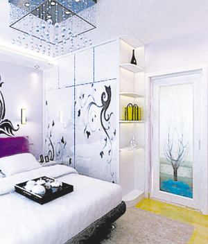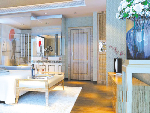 卧室:卧室的门做得相当低调,卧室所有亮点集中在床后的背景墙,其他的只能作为陪衬,门的颜色与电视柜以及花几的颜色完全一致,与地板的颜色属于同一色系(图5)。