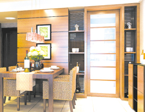 餐厅:厨房门的颜色和餐桌、餐边柜、酒柜都是同一种颜色,整体看起来相当统一,并做了横木条装饰,也加固了玻璃的稳定性(图4)。