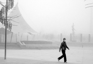 3月20日,一名男子行走在浮尘笼罩下的新疆吐鲁番市街头。