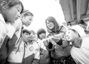 3月22日,山东省沂南县气象台的工作人员向学生们介绍气象仪器的用途。