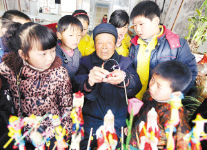 李世明老人耐心地手把手教孩子制作面塑。一团团彩色的面团,在李世明老人的指导下,经过孩子们的不懈努力,变成了一只只栩栩如生的彩色的小鸟。