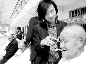 3月26日,项城市一家理发店的10余名志愿者来到项城市福利院,开展为孤寡老人送温暖活动。志愿者们和孤寡老人交谈聊天,并为老人义务理发、刮胡子,以实际行动践行雷锋精神。