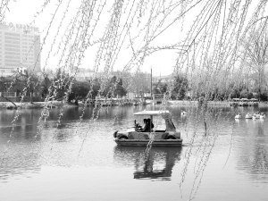 3月27日,游船从周口人民公园落花湖“柳帘”中“穿过”。春分过后,周口人民公园花红柳绿,一派春意盎然的景象。