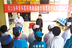 3月28日上午,周口协和骨科医院救助困难患者齐安辉捐款仪式在门诊病房综合楼一楼大厅举行,当场捐款2000多元。全国罕见、医院建院十多年来收治的第二例“强脊炎并六大关节僵直”患者齐安辉,牵动着该院领导和全体员工的心。该院医生以精湛的医术、丰富的脊柱外科和关节外科治疗经验,对其进行了“四大关节分步置换术”,手术非常成功。今年1月4日,患者入院时,躯体像根棍棒一样僵硬,经过双髋关节、双膝关节置换术后,现躯体已能坐立、下床行走。为使其坚持康复治疗直至痊愈,解决其住院期间生活中遇到的困难,医院特别为其举行了爱心捐款活动。郭伟 摄
