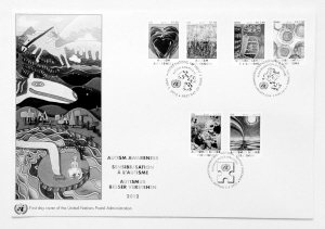 3月30日,联合国邮政管理处在纽约联合国总部举行新闻发布会,发布以提高对自闭症的认识为主题的六枚纪念邮票和两枚纪念封。该套邮票和纪念封的图案均由被诊断为自闭症的艺术家们设计,将于今年4月2日第五个“世界提高自闭症意识日”正式向公众发行。