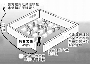 据报道,这名43岁的韩裔嫌犯吴丸原本想找学校一名女性行政人员报复遭退学之仇却扑了个空,他转念闯进教室,将正在上课的校友一一射杀。