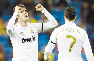 下图为皇家马德里队球员卡卡(左)庆祝进球。