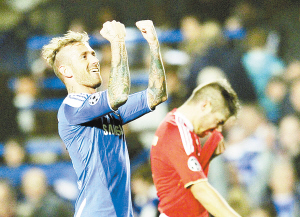 上图为切尔西队球员梅雷莱斯(左)庆祝进球。