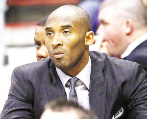 因伤休战的湖人队球员科比·布莱恩特在场边观战