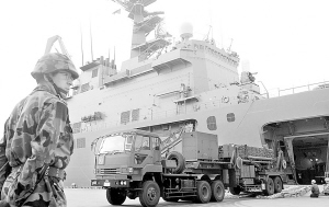 5日,冲绳,日本自卫队正在从船上卸载爱国者3反导系统,该武器将被用来拦截朝鲜火箭。