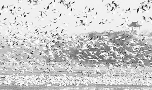 在湿地或者湖泊拍鸟,要严格遵守保护区内的规定,选好点后须静静守候,以免惊扰鸟群。早晨和傍晚是鸟群最多的时候,相对来说,傍晚斜阳中觅食而归的鸟群更加容易拍到,而且非常壮观。拍鸟的相机须有300mm以上的长焦镜头。
