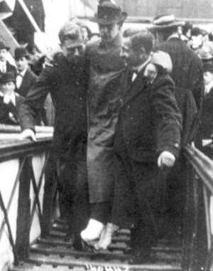左图为1912年4月,“泰坦尼克”号海难幸存者哈罗德·布莱德被扶下救生艇,他的脚受伤,继而在救生艇中被冻坏了。