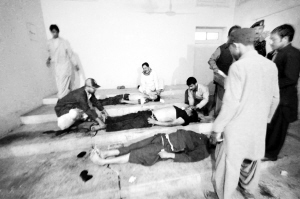 4月9日,救援人员在整理枪击事件中死亡人员的尸体。