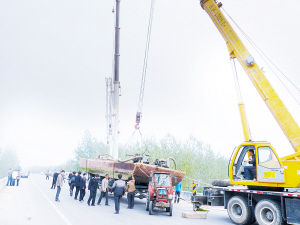 当天下午,联合执法队找来两台大型吊车,把5艘稍小一点的船只吊到了指定的岸上(如图),由专人看管。另外两艘大型采砂船,由于吊车吨位小,只能把它们开到周口港扣押。对这7艘采砂船的处理,东新区将进一步研究处置方案。