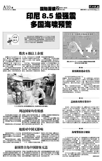 苏门答腊岛沿岸亚齐省等地区都有震感,当地居民惊慌失措,跑到街上避难。印度尼西亚官员12日说,印尼发生的8.5级强震已造成苏门答腊岛北端亚齐省5人死亡、4人受伤,还有一座桥梁垮塌。