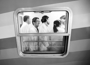 4月12日,在北京西站,即将上车开展服务工作的医护人员在参观健康快车火车医院。