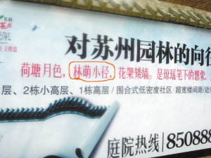 本报讯 近日,小记者发现周口七一路西段祁庄附近有一处售楼部打着一处广告,其广告词为“林萌小径”,实在让人不解。有一词语“林荫小径”,俩词语虽“长”得相似,但意思上有很大区别。不知售楼部是有意还是无意?在此,小记者呼吁广大市民,正确用字,规范用字,不滥用字。汉字,是我们中华民族的骄傲!让错别字永远消失!