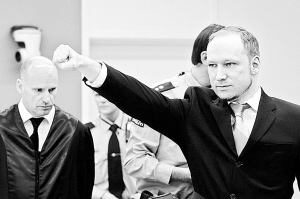 4月16日,挪威奥斯陆法院对去年“7·22”爆炸枪击案开庭审理。据称,事件制造者布雷维克的精神健康评估报告将作为判决的重要依据。挪威“7·22”爆炸枪击案共造成77人死亡。布雷维克对杀人事实供认不讳,但拒绝认罪。图为布雷维克在法院摆出极右主义手势 新华社 发