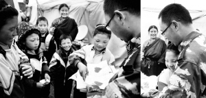 后来,孩子们被他们的亲戚接走,住在位于赛马场的临时安置点内。支队官兵时常会去看看这些可爱的孩子,并给他们送去一些生活用品。每每见到支队的“阿爸”们来到家里,孩子们总是很开心。拉毛高兴地说:“这次‘阿爸’给我们带来了新书包,里面还有新华字典、彩笔和美术本。”