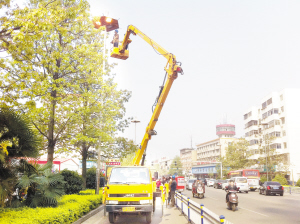 4月17日上午,市政管理处路灯队的工作人员正在对七一路上的路灯进行检修。根据中心城区综合整治的统一安排,本月底前,中心城区所有路灯必须全部亮起来。为此,市政管理处工作人员正抓紧时间排查,整修故障路灯。晚报记者 张志新 摄