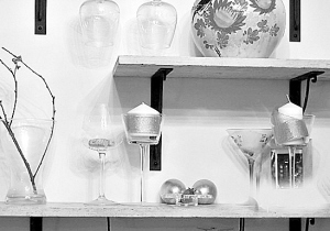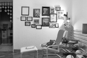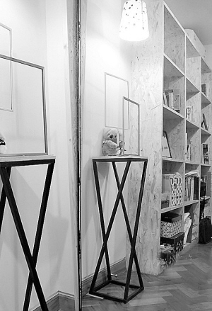 房子不仅要实用,还要美观,要有一些地方用来展示,小户型也是如此,但是制作专门的展示柜或陈列柜不太现实,可以利用客厅墙体的空白处,做一些用来展示的设计,如在靠近书架的地方摆了一个几何造型的陈列架,与墙上的几何形状相框相呼应,在比较高的位置做了长短不一的隔板,用于摆放饰品(图6);还可以在另一面墙挂上各种大小的相框,既填补墙体的空白,又起到装饰作用。