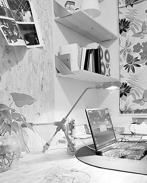 在客厅的另一边,设计了一个靠墙的办公桌,宽大的桌子可以放置很多东西,办公桌上有两块小隔板,用于放置一些常用书刊和资料等,成为工作区(图3);在工作区旁边放置一张小圆几和一张躺椅,就是休闲区,可以看书、听歌,得到初步的休息(图4);在与工作区正对的墙壁,设计了一个靠墙的大书柜,相当于书房,并不是用实体墙间隔(图5)。