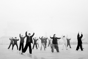4月19日,周口出现大雾天气,当地气象部门当日6时35分发布大雾橙色预警信号,提醒公众谨慎出行。图为周口市区市民在雾中晨练。