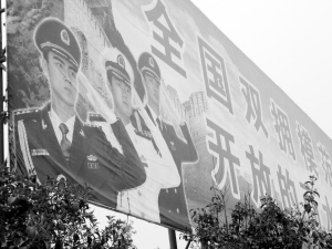 商水县周商大道上的一块“双拥”宣传牌,海陆空三军将士用左手敬礼。