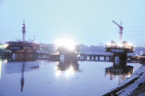昨晚,市区横跨沙颍河的在建八一大道大桥上,灯火通明,几台重型机械在工人的操作下轰轰作响,承担大桥建设的施工人员正紧张忙碌着。为确保大桥如期竣工,施工人员加班加点,连夜奋战。晚报记者 朱海龙 摄
