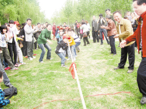 上午10时许,春游队伍经历了一番行程后,在一片开阔的草坪上停留下来。接下来举办了热火朝天的拔河运动(如图),女生与女生比赛,男生与男生较量。最后,在“贵在参与”思想支配下,按捺不住激情的随行家长们也强烈要求参加拔河。一时间,加油声、口哨声、欢笑声响彻云霄,引得不少游客和行人驻足欣赏。