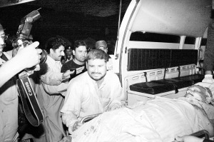 4月24日,在巴基斯坦东部城市拉合尔,救援人员转移一名遇难者的遗体。