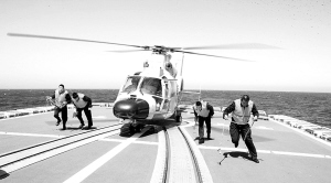 14时05分,赶至出事海域的一艘作战舰艇发现一名落水人员,随即引导刚刚赶来的直升机展开快速救援,将救出的落水人员送至医院船上。5分钟后,另一艘舰艇救起第二名落水人员。