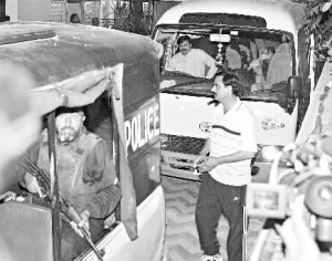 一辆白色的小型巴士26日午夜停在本·拉登家人位于巴基斯坦首都伊斯兰堡的住所外,准备接他们去机场。