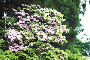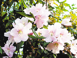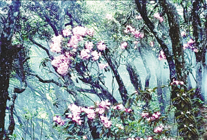 杜鹃花是井冈山的市花,目前已查明的品种有32种,主要有开白花的江西杜鹃、开红花的映山红、开粉红色的鹿角杜鹃、云锦杜鹃、开粉红至白花的猴头杜鹃、开淡红紫色花的红毛杜鹃,还有井冈山所特有的珍稀树种——开淡紫红色花、具有香味的井冈山杜鹃等。特别奇特的是,杜鹃一般都是灌木,而井冈山的杜鹃却是乔木,每棵都高达15米以上,干围1米左右,开出的花朵呈五角形,大的如碗口,小的像钮扣,有的一棵树上竟开着几种颜色的花。