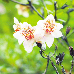 春季到井冈山,一定要到笔架山一睹“十里杜鹃花长廊”的壮观。“十里杜鹃花长廊”绵亘在笔架山17峰的峰脊上,沿着悬崖陡峭的山脊,在七八米高的虬曲盘错的枝干上,各色盛开的杜鹃,一组组,一丛丛,密密匝匝地伸向蓝天。在井冈山随处都可目睹杜鹃花的风采,不过最美的应该在五指峰下的水口景区。那里有一座名叫“彩虹”的瀑布,贴崖飞下80米。围绕这座瀑布四周的景观,诸如鹃岛、鹃苑、鹃壑、鹃池,皆以杜鹃命名。