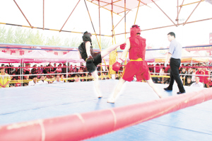 4月29日至5月1日,河南卫视《武林风》栏目在羲皇故都淮阳县摆下擂台,广发英雄帖邀请河南、安徽、湖北、河北等八省武林高手展示身手。图为比赛现场。晚报记者 徐松 摄