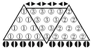下图中有三个三角形,每个三角形都内含10个相同的数字,分别是1、2、3。所有数字排列成4行,每行数字之和都是15。请你开动脑筋,移动这三个三角形,使这些数字排列成5行,且每行数字之和都等于12。应该怎样移动呢?